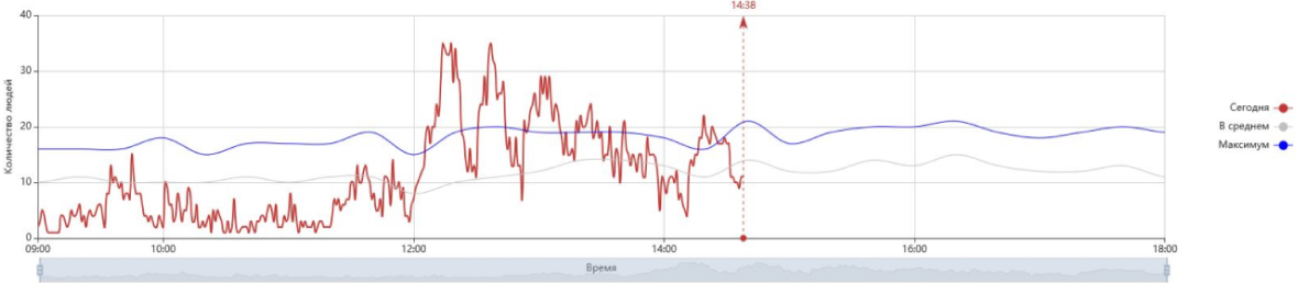 Several cameras installed in the cafeteria submit the data to the video analytics system, which counts the number of people in the area covered by the camera. When two or more cameras work in the same room, an image overlap area that has been set up using the system interface is saved. If a person comes into the scope of several cameras, they are only counted once.